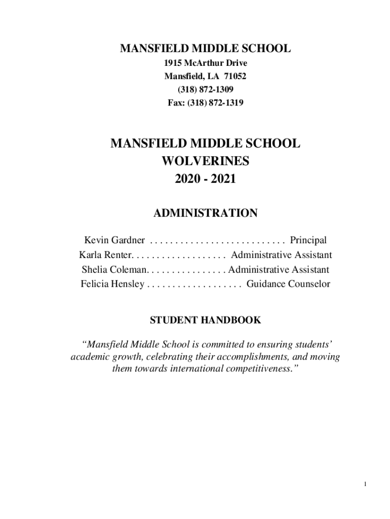 MANSFIELD MIDDLE SCHOOL 1915 McArthur Drive Mansfield, LA 71052 (318) 8721309 Fax: (318) 8721319MANSFIELD MIDDLE SCHOOL WOLVERINES 2020 2021 ADMINISTRATION Kevin Gardner. . . . . . . . . . . . . .