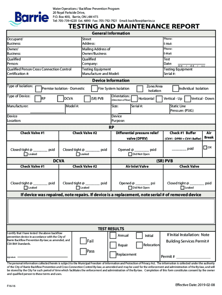 Water Operations / Backflow Prevention Program 20 Royal Park side Drive, P.O. Box 400, Barrie, ON L4M 4T5 Tel: 7057394220 Ext. 4890 Fax: 7057927921 Email: backflow@barrie.caTESTING AND MAINTENANCE