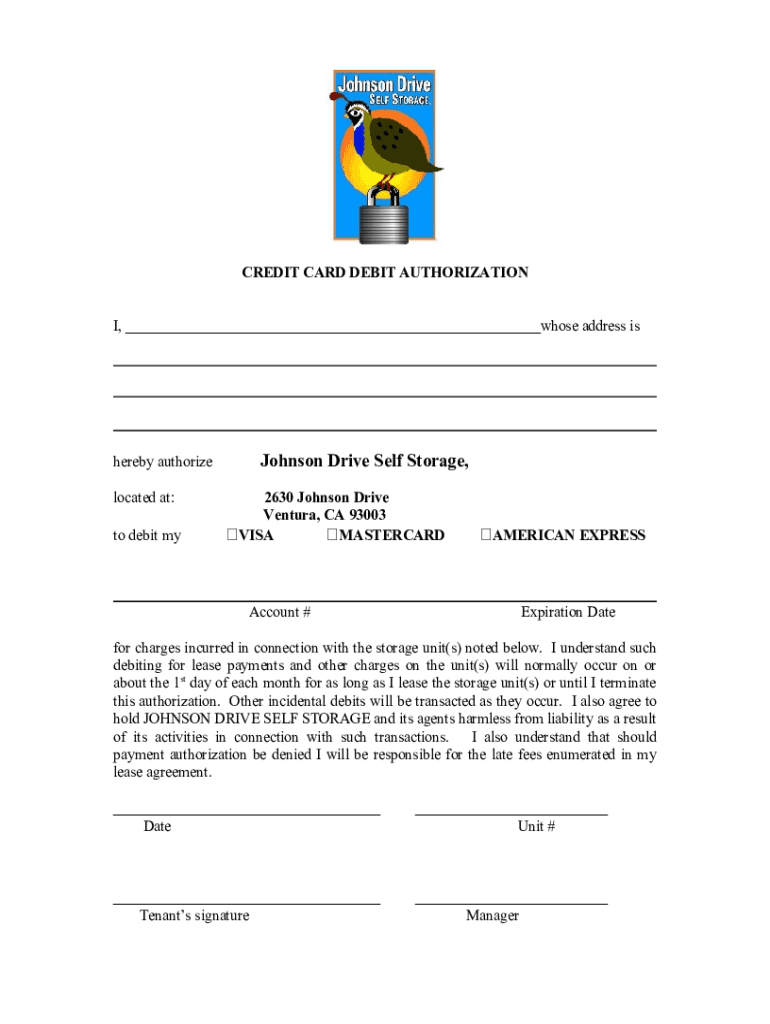 CREDIT CARD DEBIT AUTHORIZATION I, whose address is hereby authorize located at: to debit my Johnson Drive Self Storage, 2630 Johnson Drive Ventura, CA 93003 VISA MASTERCARDAccount #AMERICAN EXPRESSExpiration