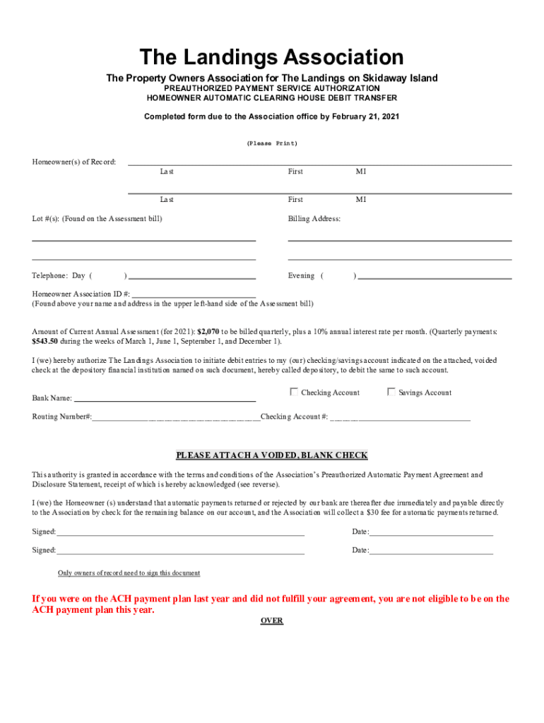 The Landings Association Property Owners Association for The Landings on Skid away Island PREAUTHORIZED PAYMENT SERVICE AUTHORIZATION HOMEOWNER AUTOMATIC CLEARING HOUSE DEBIT TRANSFERCompleted form