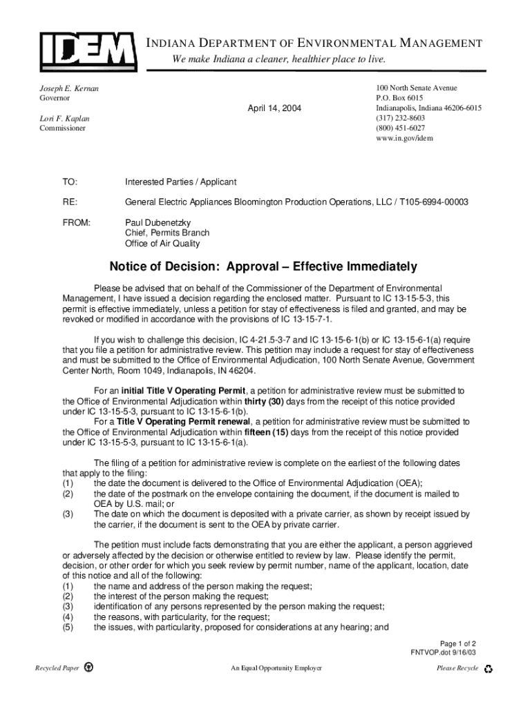 IN DIANA D DEPARTMENT OF E ENVIRONMENTAL M MANAGEMENT We make Indiana a cleaner, healthier place to live. Joseph E. Kernan Governor April 14, 2004, Lori F. Kaplan Commissioner100 North Senate Avenue