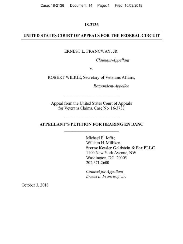 Case: 182136Document: 14Page: 1Filed: 10/03/2018182136 UNITED STATES COURT OF APPEALS FOR THE FEDERAL CIRCUITERNEST L. RAILWAY, JR. ClaimantAppellant v. ROBERT WILKIE, Secretary of Veterans Affairs,