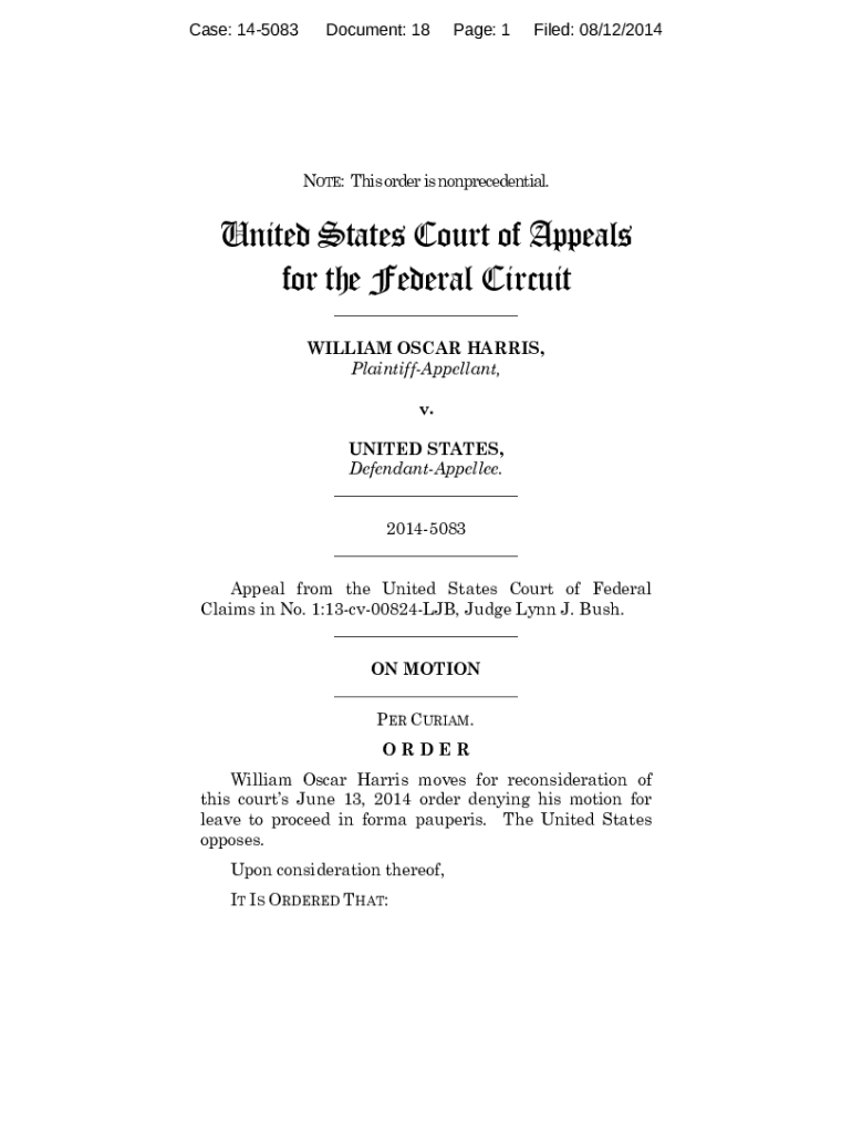 Case: 145083Document: 18Page: 1Filed: 08/12/2014NOTE: This order is nonresidential. United States Court of Appeals for the Federal Circuit WILLIAM OSCAR HARRIS, PlaintiffAppellant, v. UNITED STATES,