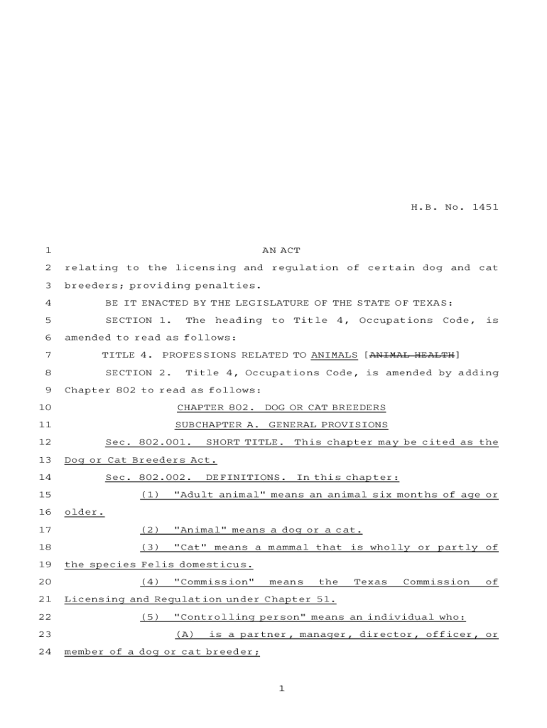 H.B.ANO. A14511AN ACT2relating to the licensing and regulation of certain dog and cat3breeders; providing penalties.4BE IT ENACTED BY THE LEGISLATURE OF THE STATE OF TEXAS:5SECTIONA1.AAThe6 7TITLE