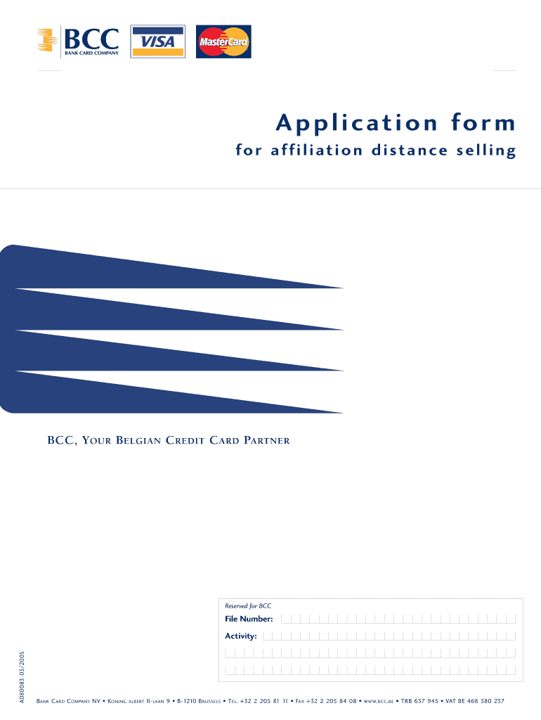 The Belgian Credit Card Affiliation Application Form is a vendor registration document used by businesses in Belgium to apply for credit card payment processing services through Bank Card Company (BCC).