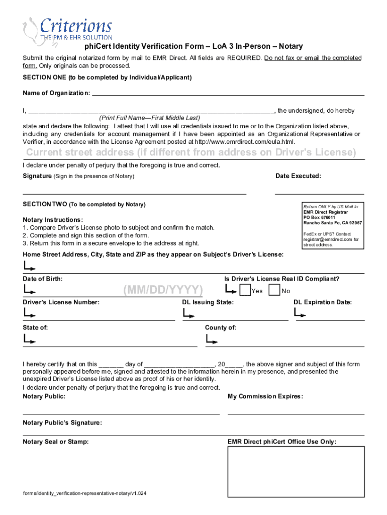 The Chicest Identity Verification Form LOA 3 Unperson Notary Submit the original notarized form by mail to EMR Direct. All fields are REQUIRED. Do not fax or email the completed form. Only originals