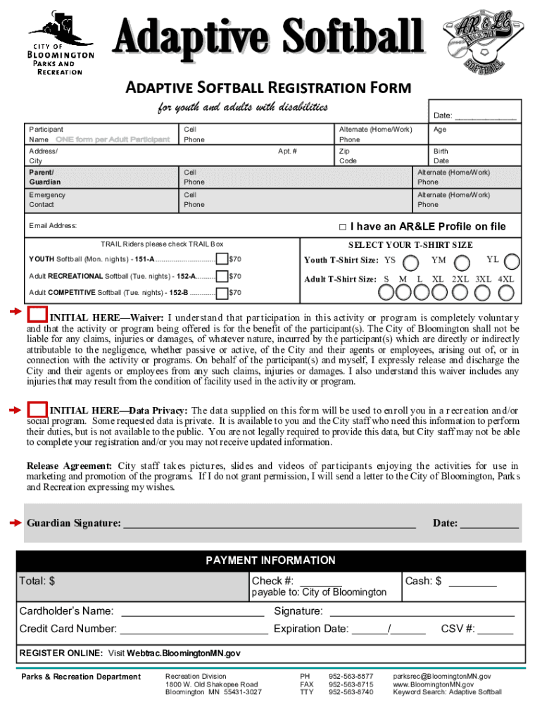 Adaptive Softball Registration Form for youth and adults with disabilities Participant Name Date: Cell Headdress/ City. #Alternate (Home/Work) PhoneAgeZip Rebirth Apparent/ GuardianCell PhoneAlternate