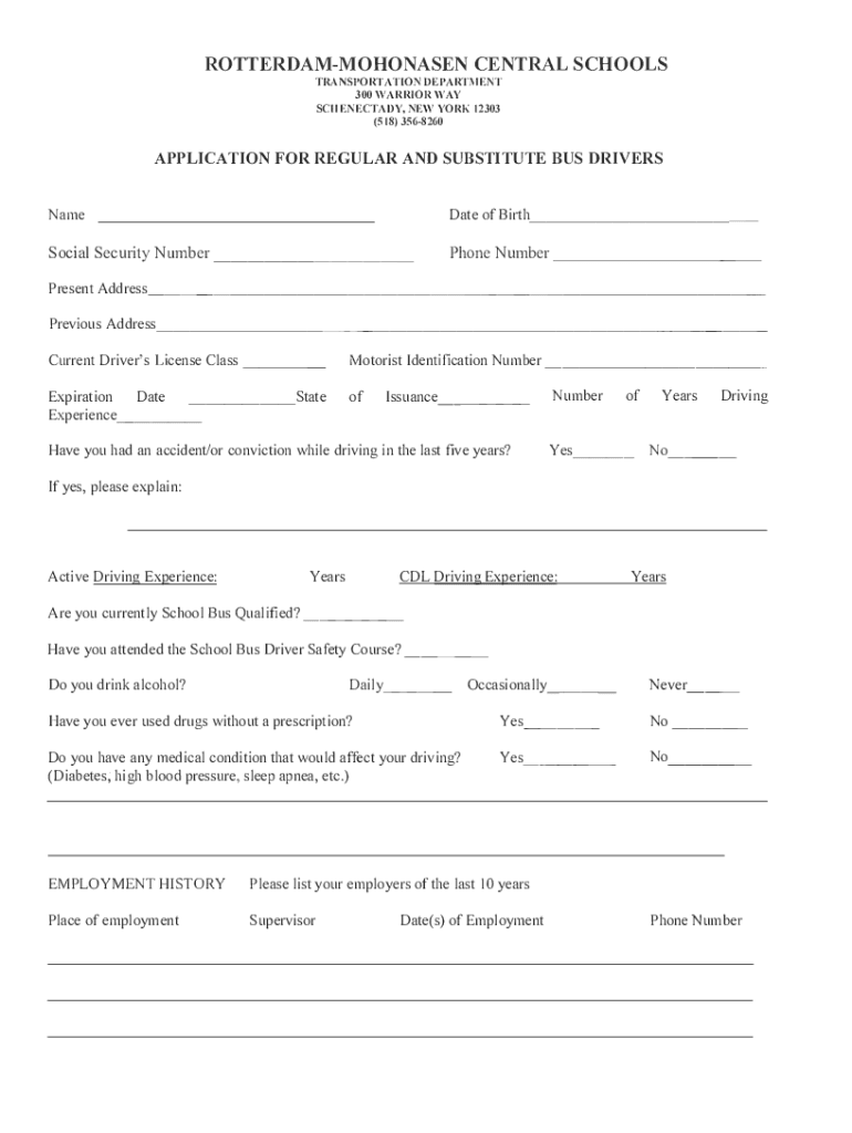 ROTTERDAMMOHONASEN CENTRAL SCHOOLS TRANSPORTATION DEPARTMENT 300 WARRIOR WAY SCHENECTADY, NEW YORK 12303 (518) 3568260APPLICATION FOR REGULAR AND SUBSTITUTE BUS DRIVERS Name Date of Bi1thSocial Security