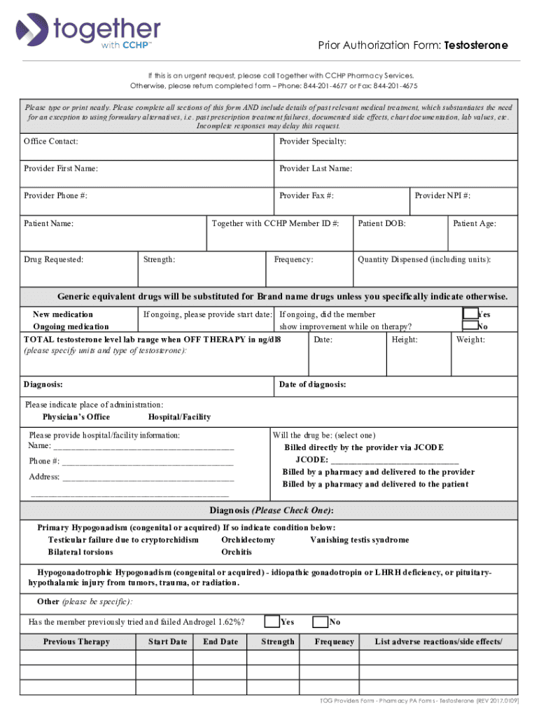 Prior Authorization Form: If this is an urgent request, please call Together with CCP Pharmacy Services. Otherwise, please return completed form Phone: 8442014677 or Fax: 8442014675Please type or