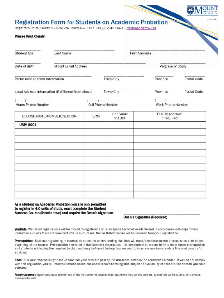 MSU.registration Form for Students on Academic Probation Registrars Office Halifax NS B3M 2J6 (902) 4576117 FAX (902) 4576498 registration MSU.please Print Clearly Student ID# Last Name First Name(s)