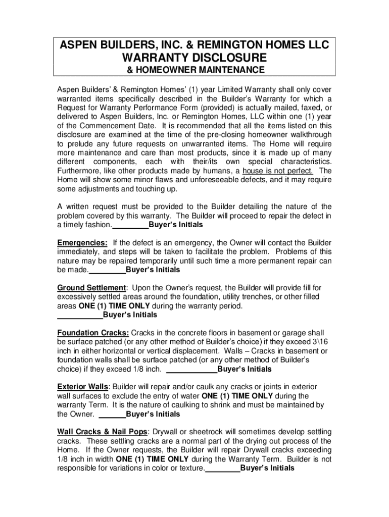 ASPEN BUILDERS, INC. & REMINGTON HOMES WARRANTY DISCLOSURE & HOMEOWNER MAINTENANCE Aspen Builders & Remington Homes (1) year Limited Warranty shall only cover warranted items specifically described