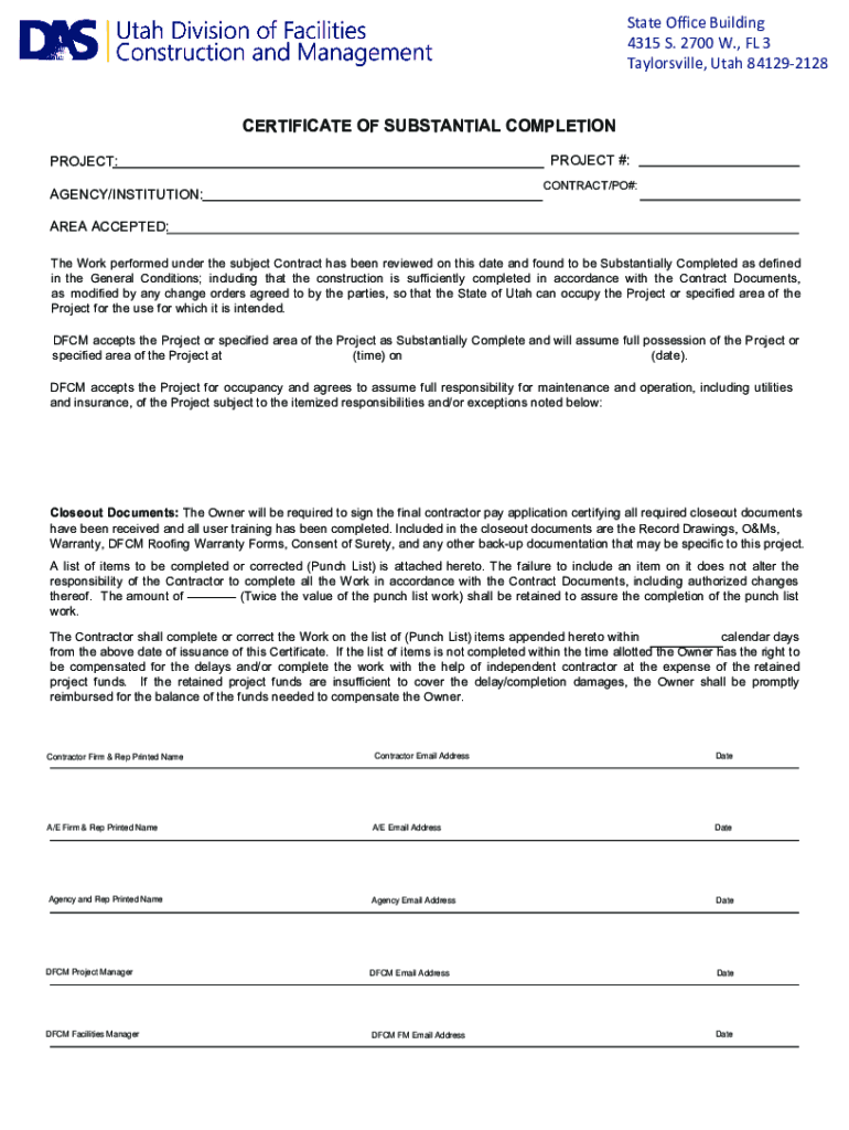 State Office Building 4315 S. 2700 W., FL 3 Taylorsville, Utah 841292128 Clear Fields CERTIFICATE OF SUBSTANTIAL COMPLETION PROJECT #:PROJECT:CONTRACT/PO#:AGENCY/INSTITUTION: AREA ACCEPTED:The Work