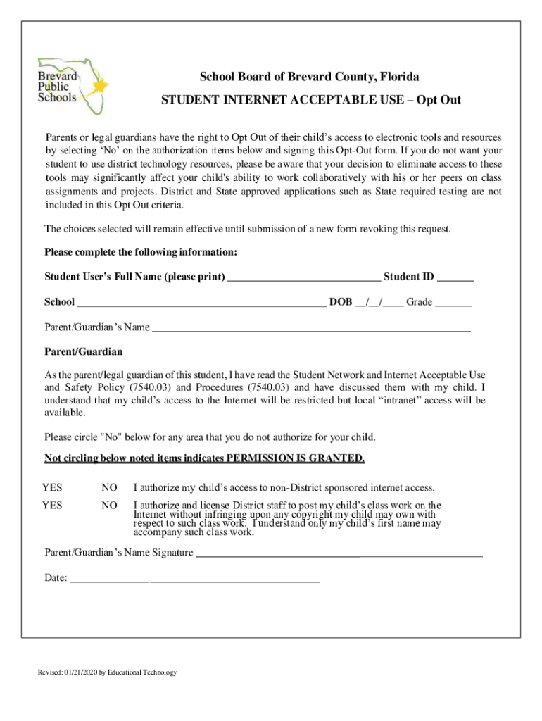 School Board of Brevard County, Florida STUDENT INTERNET ACCEPTABLE USE Opt Out Parents or legal guardians have the right to Opt Out of their children access to electronic tools and resources by selecting