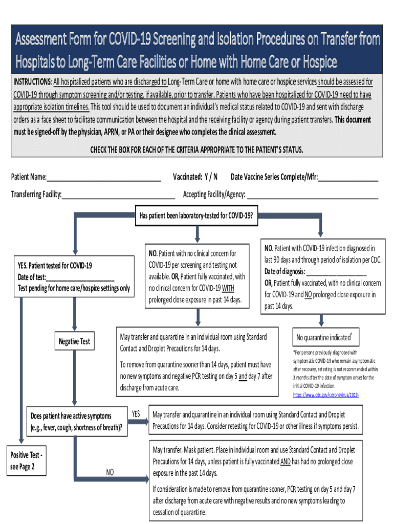 Assessment Form for COVID-19 Screening and Isolation Procedures on Transfer from Hospitals to Longer Care Facilities or Home with Home Care or Hospice INSTRUCTIONS: All hospitalized patients who are