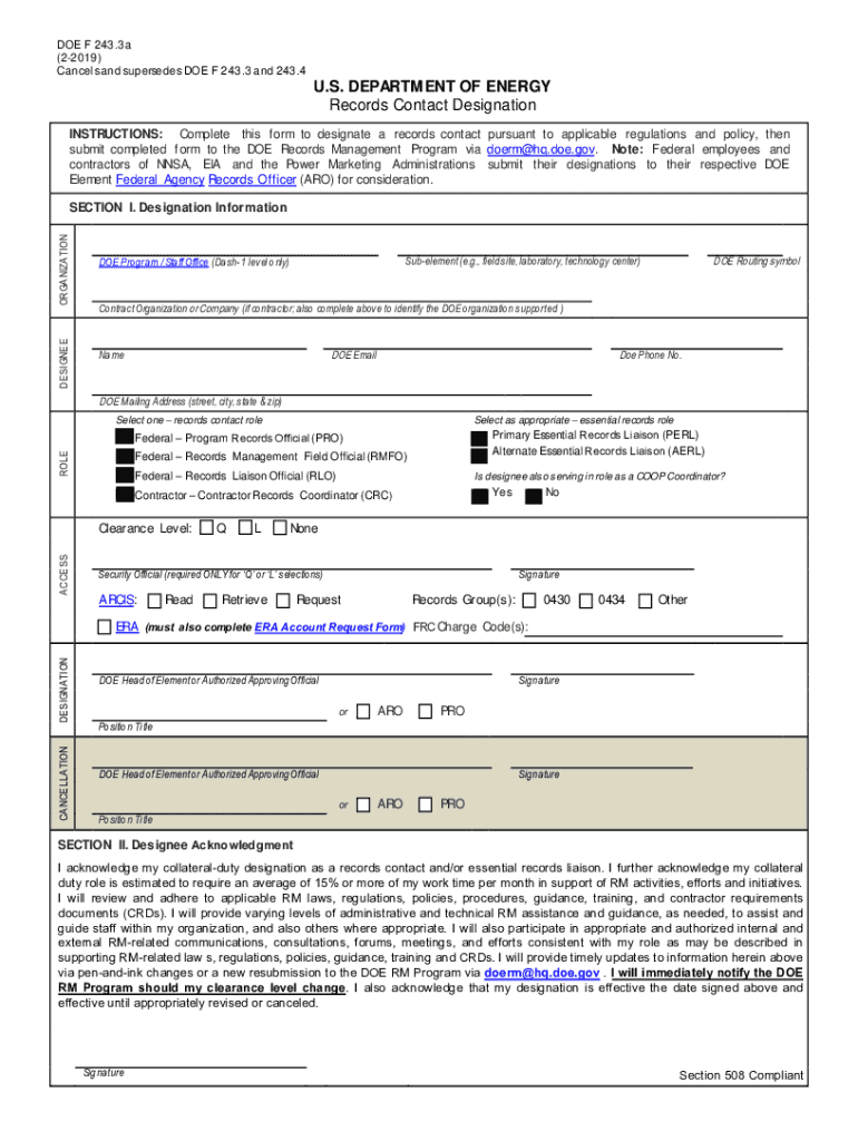 DOE F 243.3a (22019) Cancel sand supersedes DOE F 243.3 and 243.4U. S. DEPARTMENT OF ENERGY Records Contact Designation INSTRUCTIONS: Complete this form to designate a records contact pursuant to