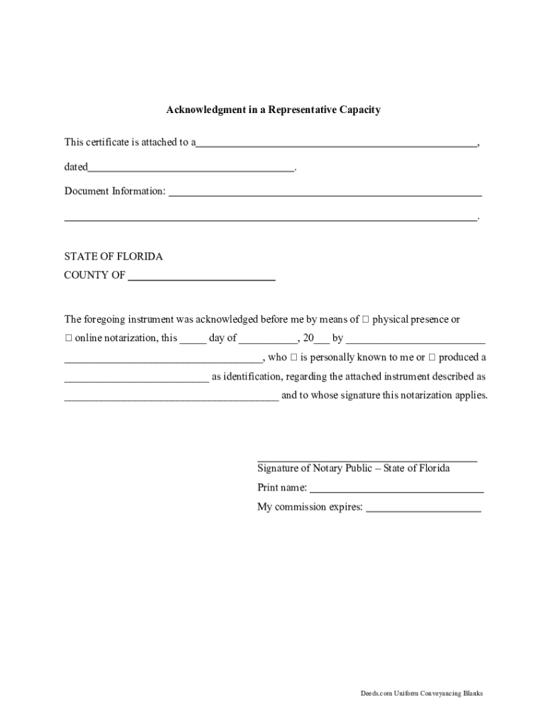 Acknowledgment in a Representative Capacity This certificate is attached to a dated, Document Information:. STATE OF FLORIDA COUNTY Of the foregoing instrument was acknowledged before me by means
