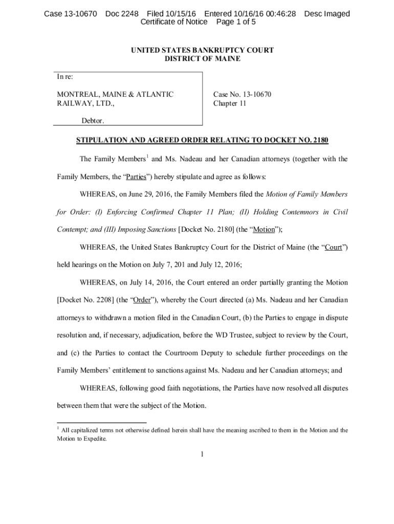 Case 1310670Doc 2248Filed 10/15/16 Entered 10/16/16 00:46:28 Certificate of Notice Page 1 of 5Desc ImagedUNITED STATES BANKRUPTCY COURT DISTRICT OF MAINE In re: Case No. 1310670 Chapter 11MONTREAL,