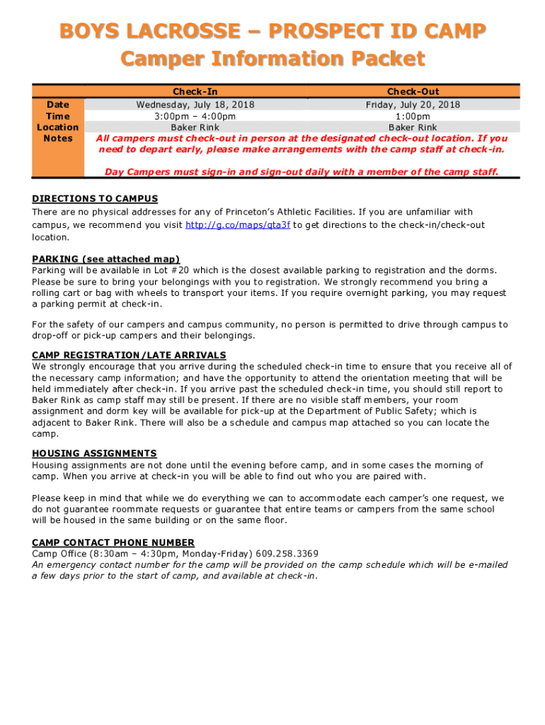 BOYS LACROSSE PROSPECT ID CAMP Camper Information Packet Date Time Location NotesCheckIn Checkout Wednesday, July 18, 2018, Friday, July 20, 2018 3:00pm 4:00pm 1:00pm Baker Rink All campers must check