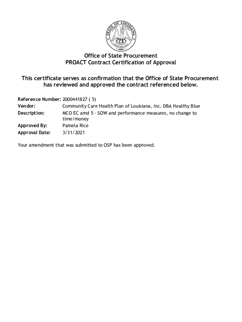 Office of State Procurement PRO ACT Contract Certification of Approval This certificate serves as confirmation that the Office of State Procurement has reviewed and approved the contract referenced