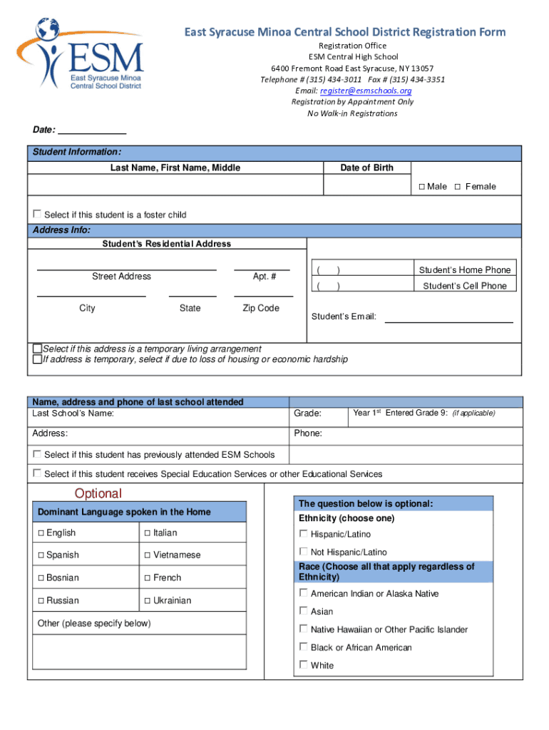 East Syracuse Minor Central School District Registration Form Registration Office ESM Central High School 6400 Fremont Road East Syracuse, NY 13057 Telephone # (315) 4343011 Fax # (315) 4343351 Email:
