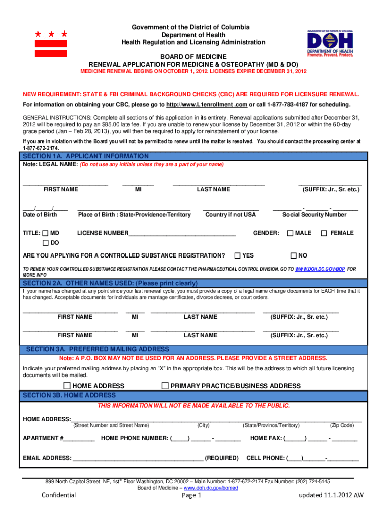 Government of the District of Columbia Department of Health, Health Regulation and Licensing Administration BOARD OF MEDICINE RENEWAL APPLICATION FOR MEDICINE & OSTEOPATHY (MD & DO) MEDICINE RENEWAL