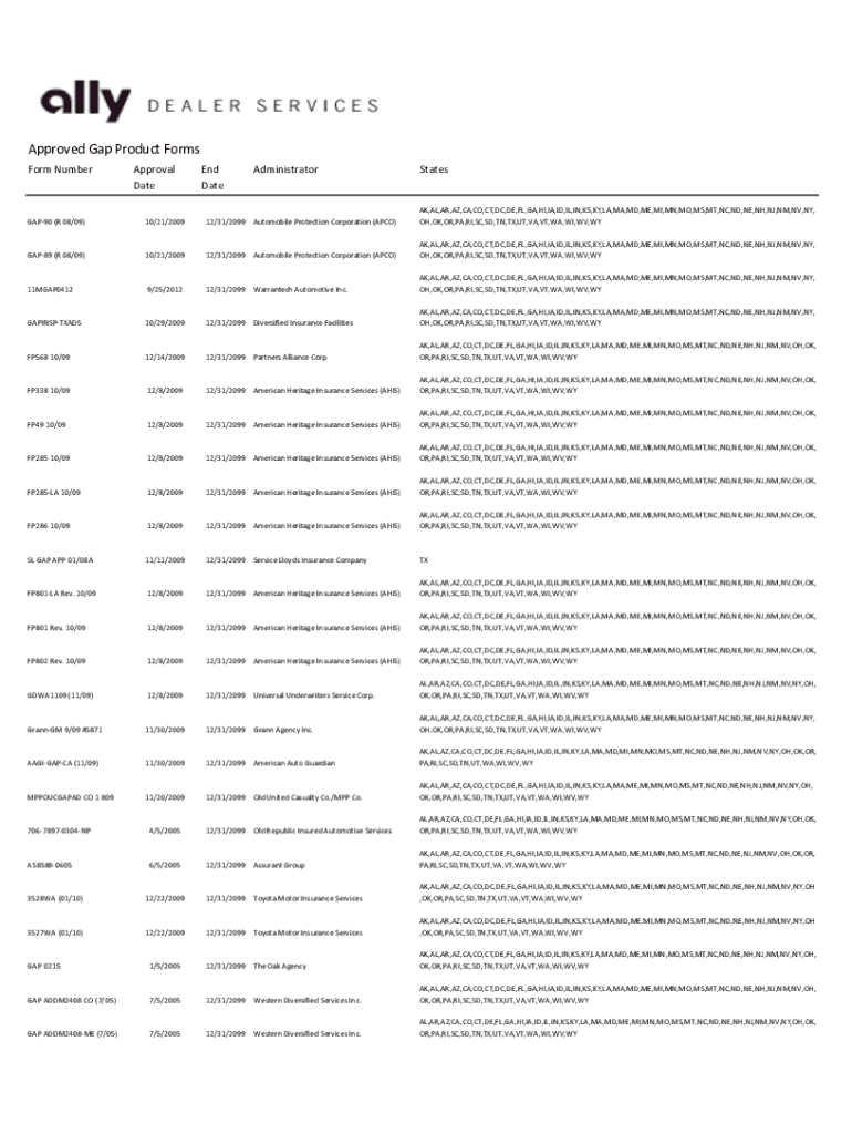 Approved Gap Product Forms Form NumberApproval Attend DateAdministratorStatesGAP90 (R 08/09)10/21/200912/31/2099 Automobile Protection Corporation (APC)AK, AL, AR, AZ, CA, CO, CT, DC, DE, FL, GA,