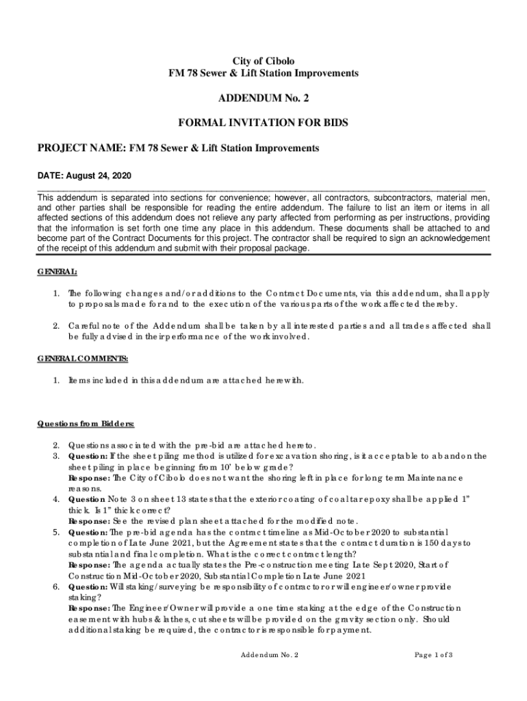 City of COBOL FM 78 Sewer & Lift Station ImprovementsADDENDUM No. 2 FORMAL INVITATION FOR BIDS PROJECT NAME: FM 78 Sewer & Lift Station Improvements DATE: August 24, 2020, This addendum is separated