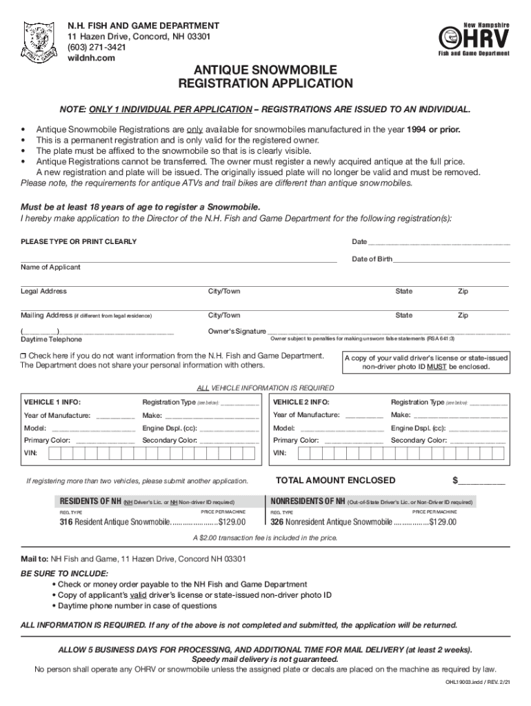N.H. FISH AND GAME DEPARTMENT11 Haven Drive, Concord, NH 03301 (603) 2713421 wild. Come HampshireFish and Game DepartmentANTIQUE SNOWMOBILE REGISTRATION APPLICATIONNOTE: ONLY 1 INDIVIDUAL PER APPLICATION