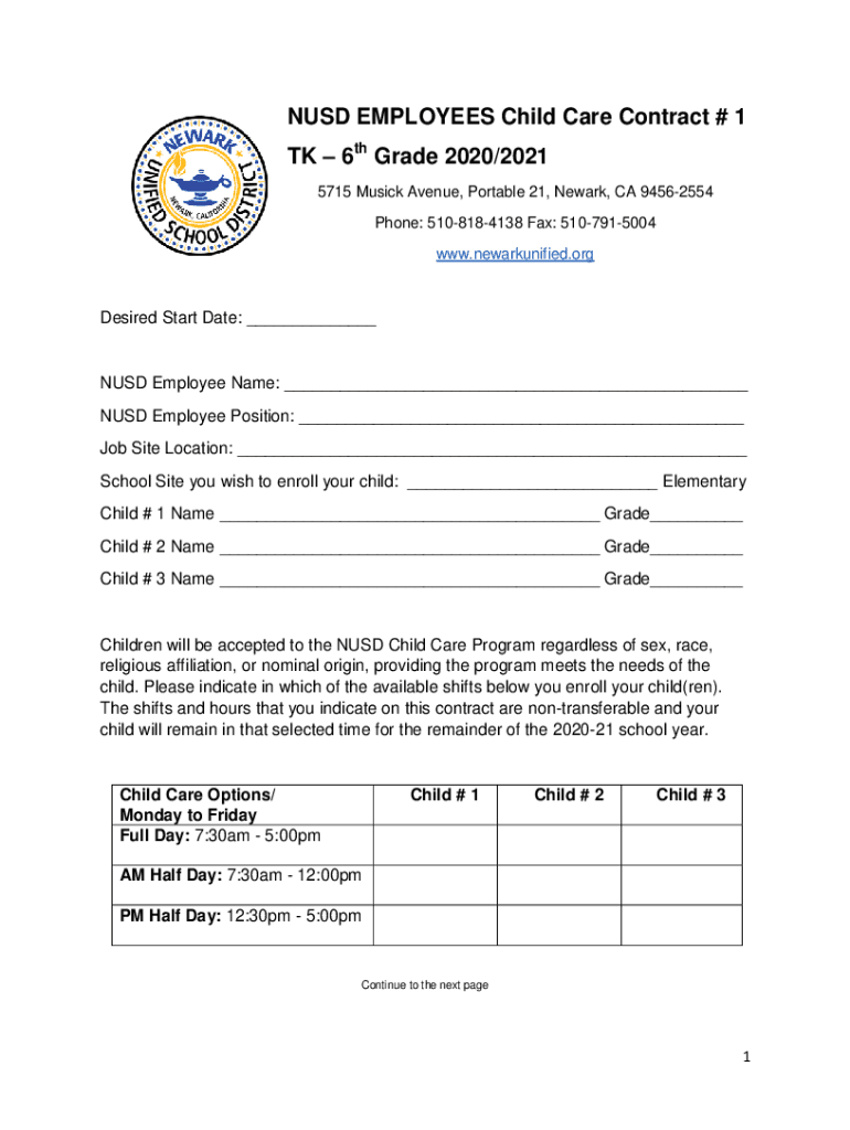 NUS EMPLOYEES Child Care Contract # 1 TK 6th Grade 2020/2021 5715 Music Avenue, Portable 21, Newark, CA 94562554 Phone: 5108184138 Fax: 5107915004 www.newarkunified.orgDesired Start Date: NUS Employee