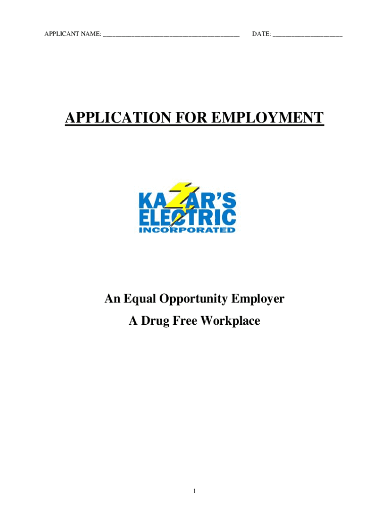 APPLICANT NAME: DATE: APPLICATION FOR Employment Equal Opportunity Employer A Drug Free Workplace1APPLICATION FOR EMPLOYMENT An Equal Opportunity Employer A Drug Free Workplace Hazard Electric, Inc.
