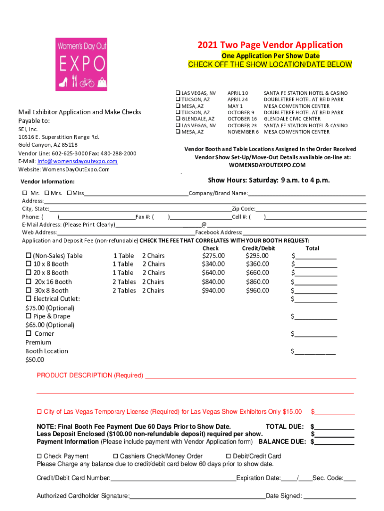 2021 Two-Page Vendor Application One Application Per Show Date CHECK OFF THE SHOW LOCATION/DATE BELOW LAS VEGAS, NV TUCSON, AZ MESA, AZ TUCSON, AZ GLENDALE, AZ LAS VEGAS, NV MESA, AZ Gmail Exhibitor