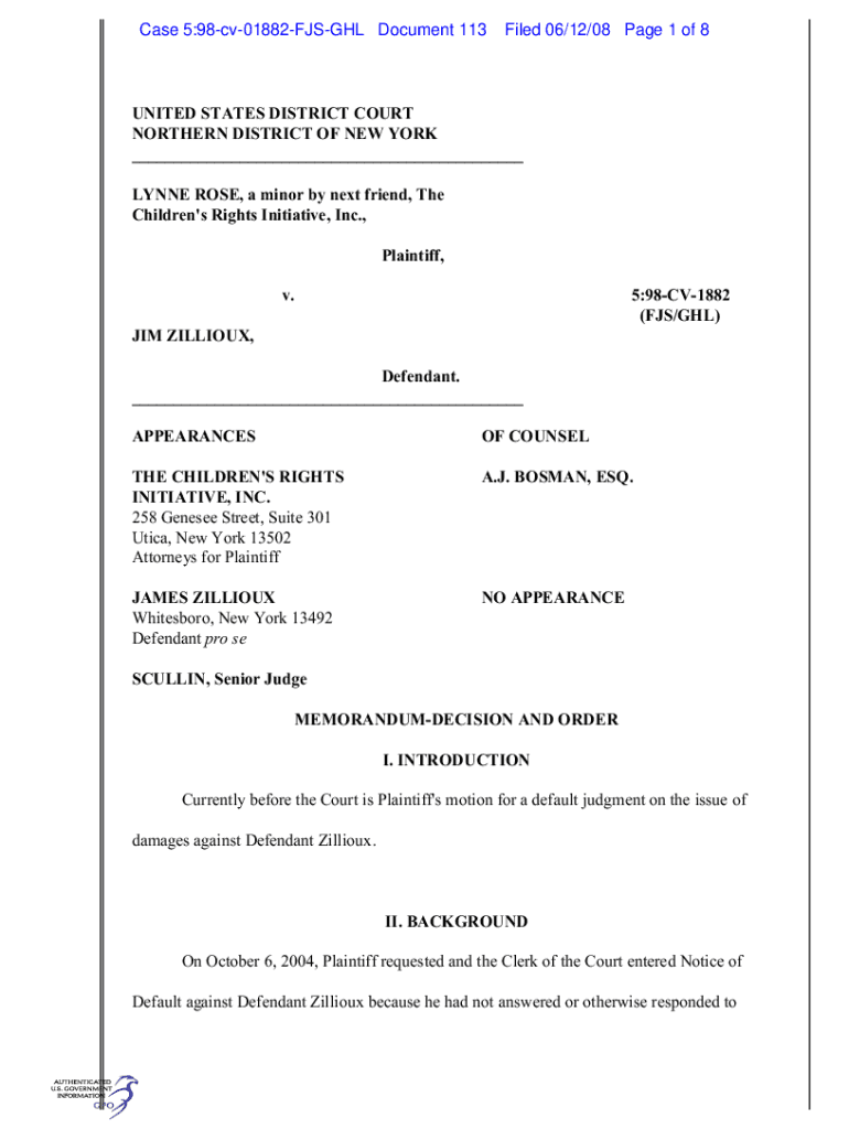 Case 5:98cv01882FJSGHL Document 113Filed 06/12/08-Page 1 of 8UNITED STATES DISTRICT COURT NORTHERN DISTRICT OF NEW YORK LYNNE ROSE, a minor by next friend, The Children's Rights Initiative, Inc.,