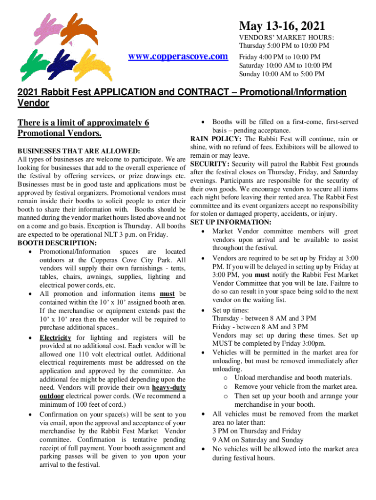 May 1316, 2021 VENDORS MARKET HOURS: Thursday 5:00 PM to 10:00 Powwow.copperascove.com Friday 4:00 PM to 10:00 PM Saturday 10:00 AM to 10:00 PM Sunday 10:00 AM to 5:00 PM2021 Rabbit Fest APPLICATION