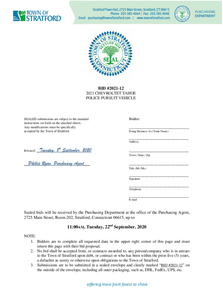 PURCHASING BID #202112 2021 CHEVROLET TAHOE POLICE PURSUIT VEHICLESEALED submissions are subject to the standard instructions set forth on the attached sheets. Any modifications must be specifically