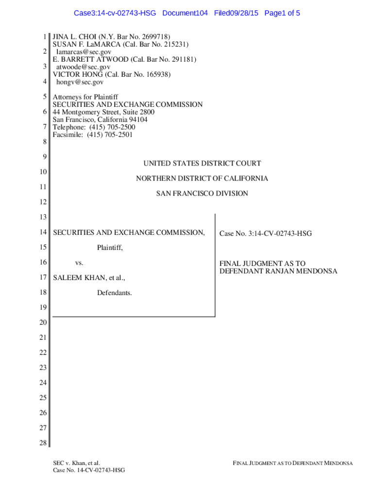 Case3:14cv02743HSG Document104 Filed09/28/15 Page1 of 5 1 NINA L. CHOIR (N.Y. Bar No. 2699718) SUSAN F. Lamarck (Cal. Bar No. 215231) 2 lamarcas@sec.gov E. BARRETT ATWOOD (Cal. Bar No. 291181) 3 atwoode@sec.gov