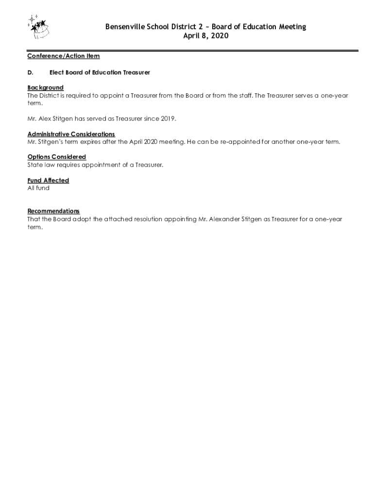Bentonville School District 2 Board of Education Meeting April 8, 2020, Conference/Action Item D. Elect Board of Education TreasurerBackground The District is required to appoint a Treasurer from