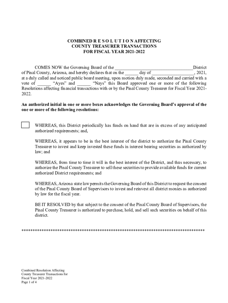 COMBINED R E S O L U T I O N AFFECTING COUNTY TREASURER TRANSACTIONS FOR FISCAL YEAR 20212022 COMES NOW the Governing Board of the District of Pinal County, Arizona, and hereby declares that on the