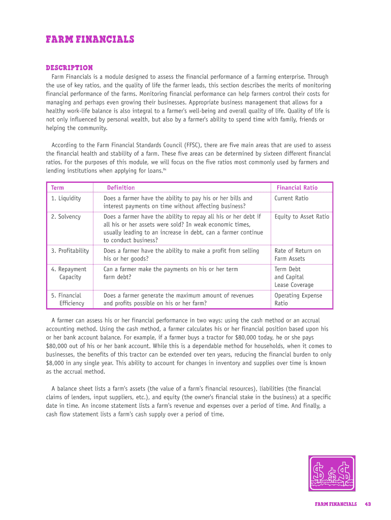 The Farm Financials Assessment Form is a vital tool for farmers to evaluate their agricultural financial health. It provides a structured approach to assessing financial performance through key financial ratios, enabling farmers to gain insights into their financial viability.