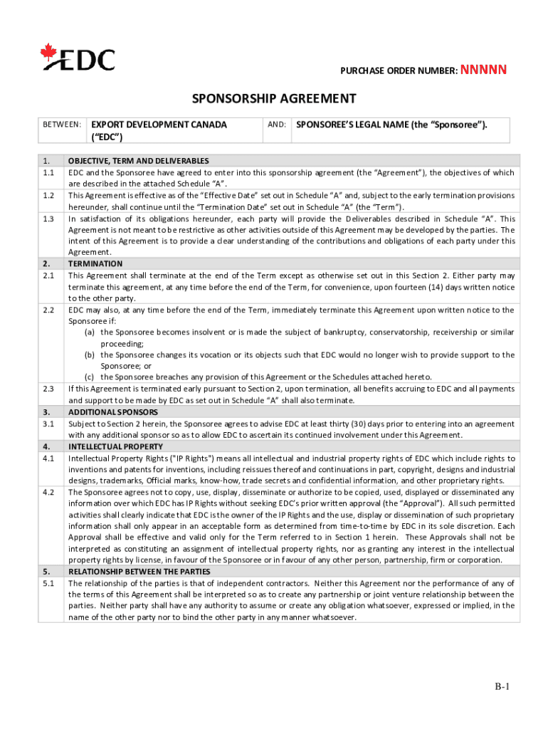 PURCHASE ORDER NUMBER: NNNNNSPONSORSHIP AGREEMENT BETWEEN:1. 1.1 1.2 1.32. 2.12.22.3 3. 3.1 4. 4.14.25. 5.1EXPORT DEVELOPMENT CANADA (EDC)AND:SPONSORED LEGAL NAME (the Sponsored).OBJECTIVE, TERM AND