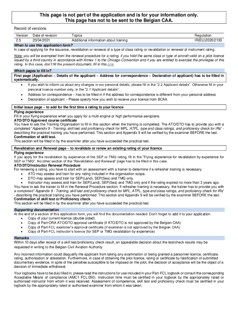 This page is not part of the application and is for your information only. This page has not to be sent to the Belgian CAA. Record of versions Version Date of revision Topics Regulation 2.5 20/04/2021