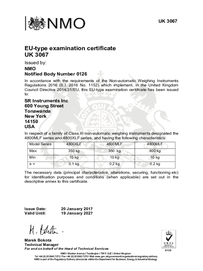 UK 3067EUtype examination certificate UK 3067 Issued by: NO Notified Body Number 0126 In accordance with the requirements of the Non-Nonautomatic automatic Weighing Instruments Regulations 2016 (S.I.