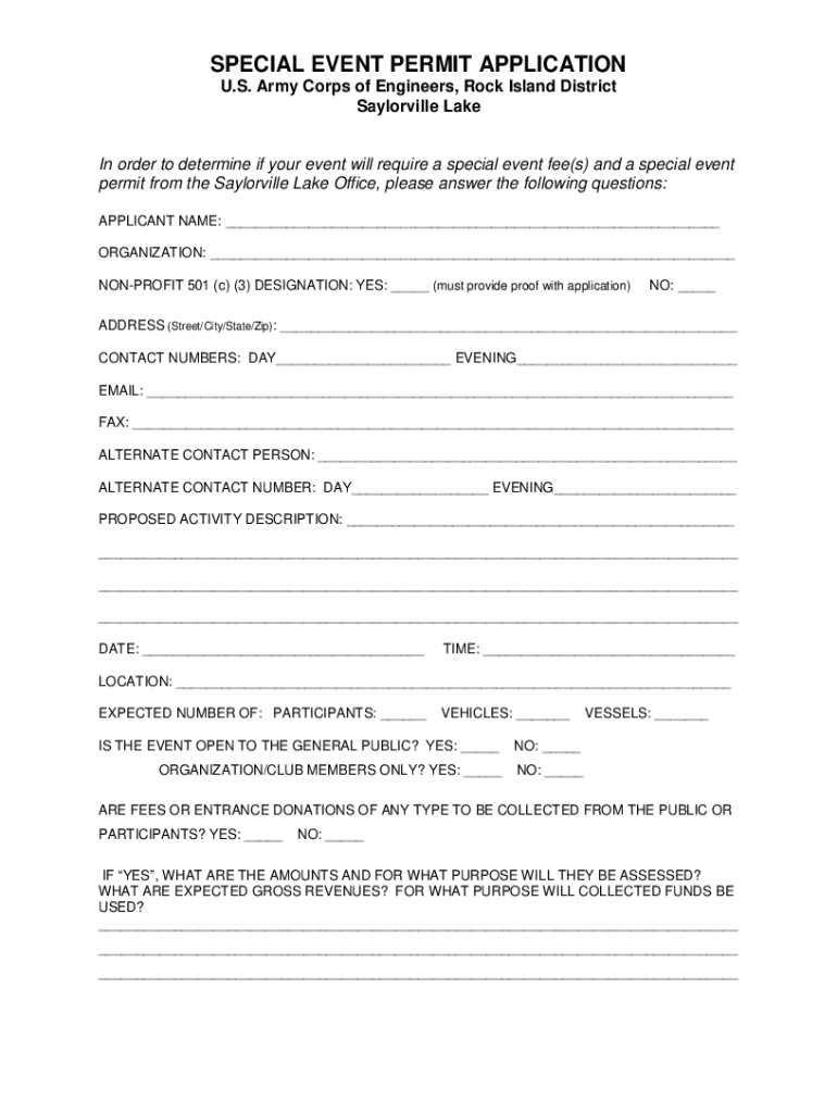 SPECIAL EVENT PERMIT APPLICATION U.S. Army Corps of Engineers, Rock Island District Taylorsville Lake In order to determine if your event will require a special event fee(s) and a special event permit