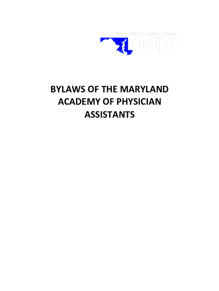 BYLAWS OF THE MARYLAND ACADEMY OF PHYSICIAN ASSISTANTSArticle 1 Name and Offices Section 1. Name The following are the Bylaws of the Maryland Academy of Physician Assistants, herein noted as Maryland