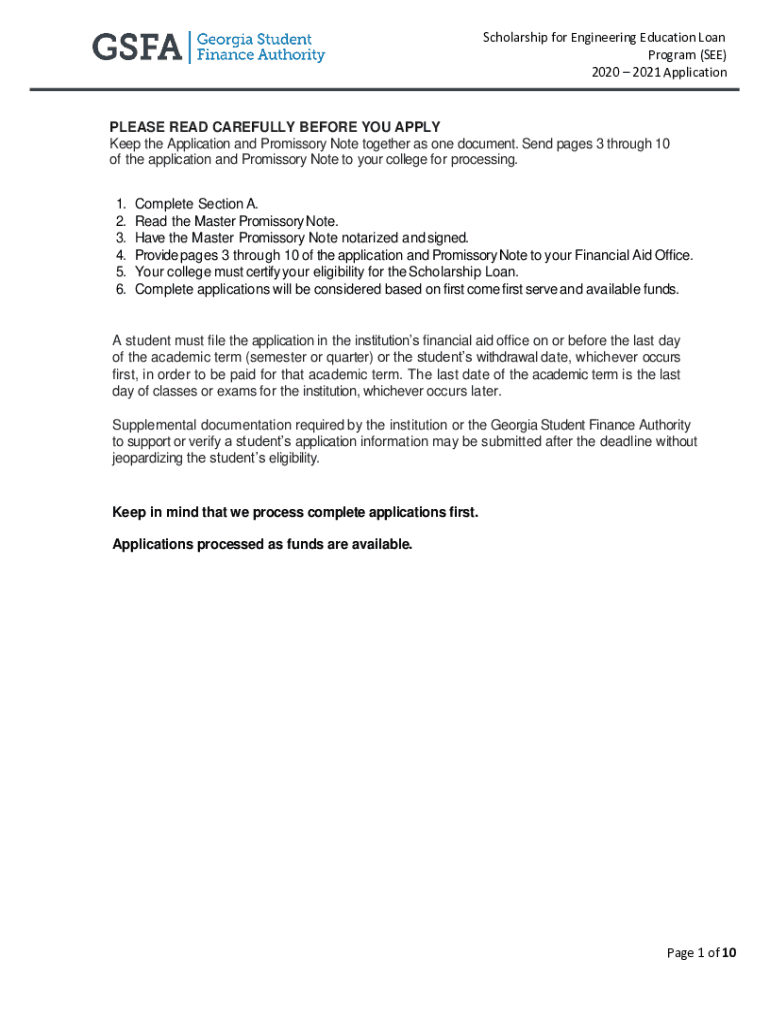 Scholarship for Engineering Education Loan Program (SEE) 2020 2021 ApplicationPLEASE READ CAREFULLY BEFORE YOU APPLY Keep the Application and Promissory Note together as one document. Send pages 3