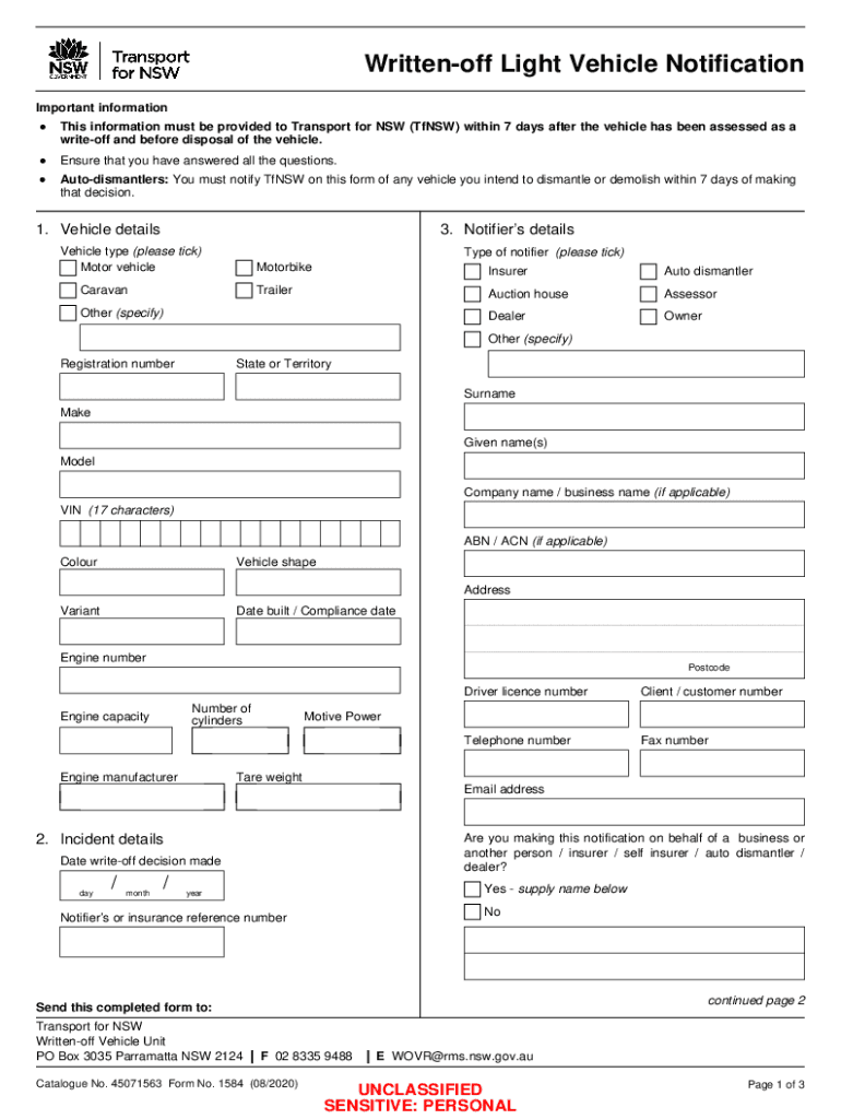 Written off Light Vehicle Notification Important information This information must be provided to Transport for NSW (Tons) within 7 days after the vehicle has been assessed as a write-off and before