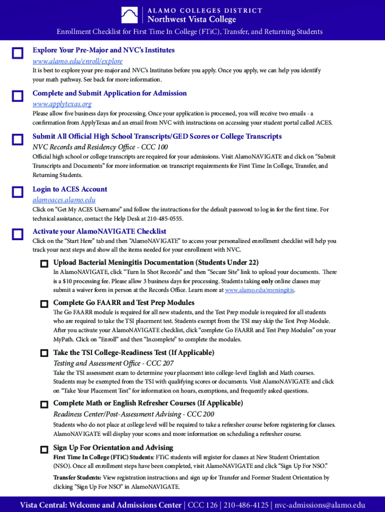 Enrollment Checklist for First Time In College (FTC), Transfer, and Returning Students Explore Your Predator and NCS Institutes www.alamo.edu/enroll/exploreIt is best to explore your predator and