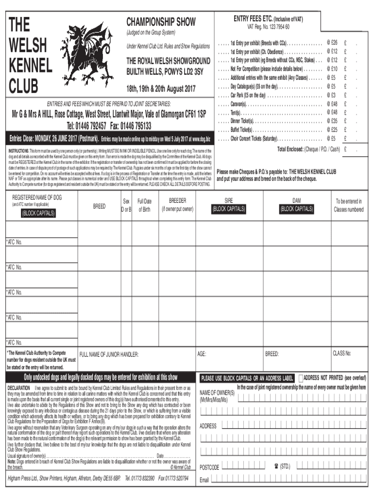 THE WELSH KENNEL COUNTRY FEES ETC. (Inclusive of VAT)CHAMPIONSHIP SHOW VAT Reg. No. 123 7954 60(Judged on the Group System). . . . . . . . . . . . Under Kennel Club Ltd. Rules and Show Regulations