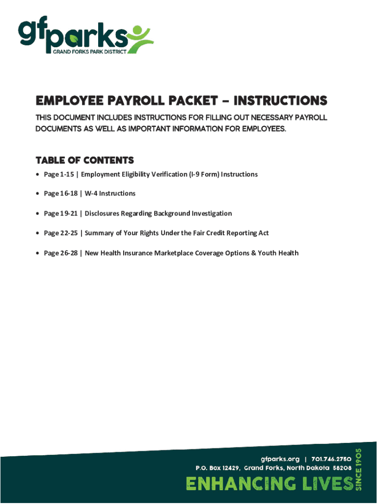 EMPLOYEE PAYROLL PACKET INSTRUCTIONS THIS DOCUMENT INCLUDES INSTRUCTIONS FOR FILLING OUT NECESSARY PAYROLL DOCUMENTS AS WELL AS IMPORTANT INFORMATION FOR EMPLOYEES.TABLE OF CONTENTS x Page 115 Employment