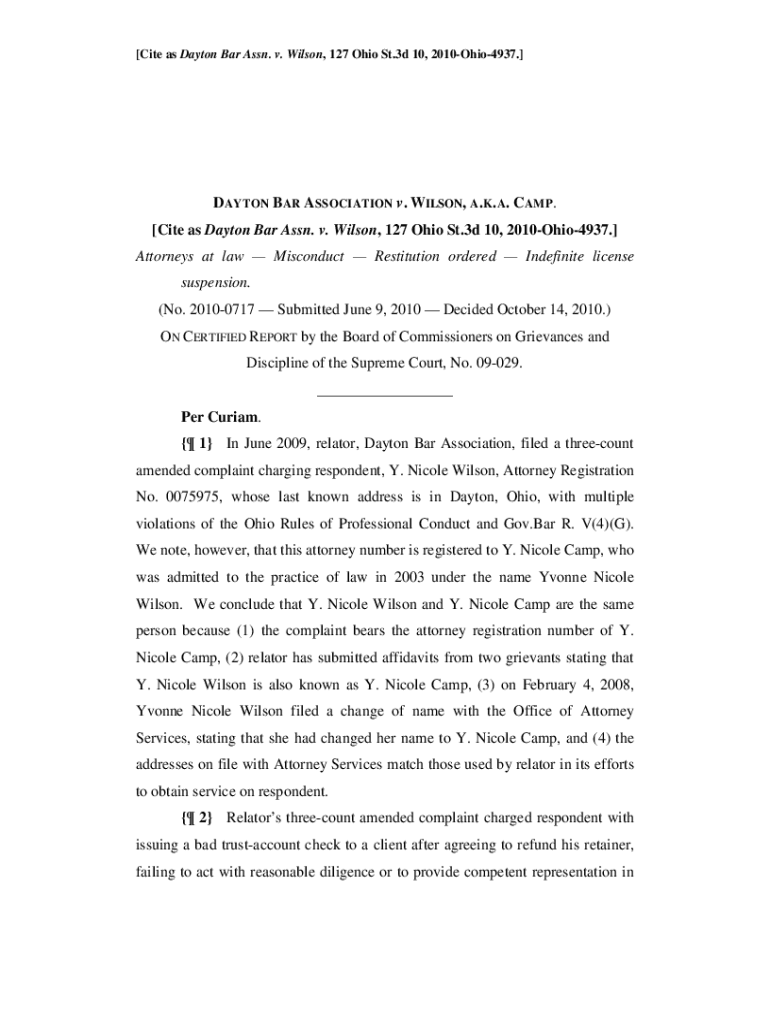 Get the free DAYTON BAR ASSN. v. WILSON, A.K.A. CAMP., 127 Ohio St.3d 10 ...