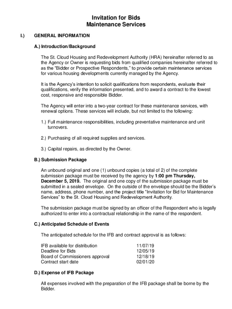 Invitation for Bids Maintenance Services I.)GENERAL INFORMATION A.) Introduction/Background The St. Cloud Housing and Redevelopment Authority (HRA) hereinafter referred to as the Agency or Owner is